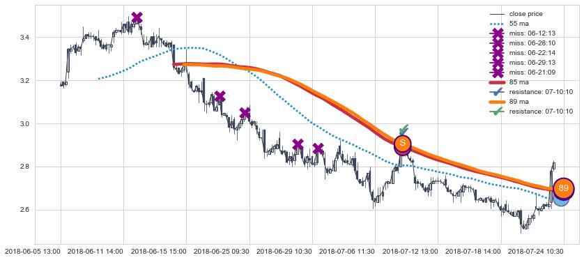 下跌趋势04-18 13:00-05-29 11:30,均线89, 85, 55确认关键阻力2处