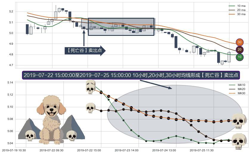 形态多维评估: ⚀ 2019-07-23 09:30:00-小时至2019-07-25 15:00:00-小时显现 10小时-20小时-30小时均线 【死亡谷】卖出点 看空信号,后市看跌,卖出