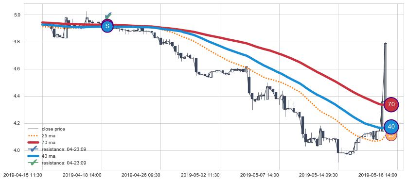 下跌趋势04-15 11:30-05-16 14:00,均线40, 70确认关键阻力1处