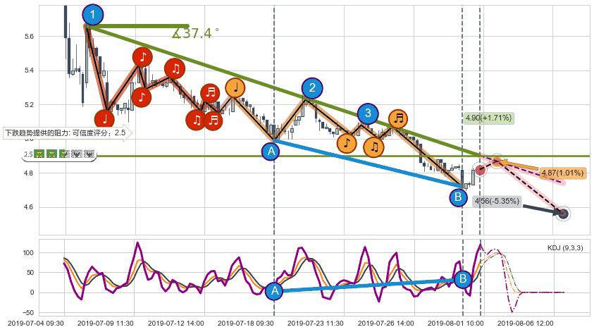 ➣ 预测:2019-08-06 15:00,【继续下探】稳定目前下跌趋势的前提下,预测价格:4.56