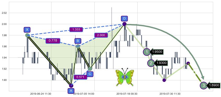 ➣ 已完成【蝴蝶】形态起点X: 06-17:14, 终点D: 07-15:13, 共114交易小时
