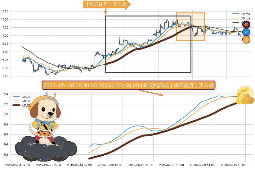 形态多维评估: ⚀ 2019-06-13 14:00:00小时-2019-07-15 11:30:00小时显现 20小时-30小时-60小时均线 【烘云托月】买入点 看多信号,后市看涨,买入