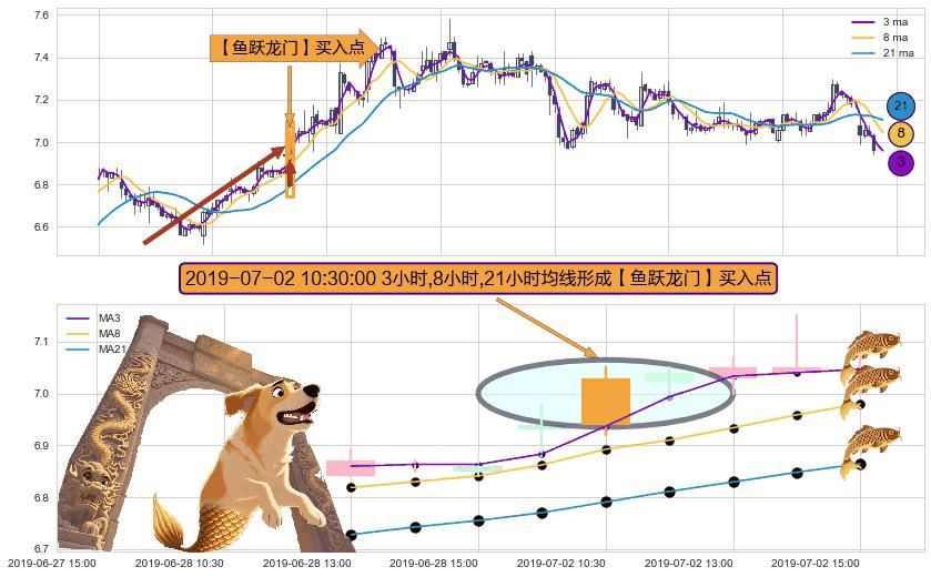 形态多维评估: ⚀ 2019-07-02 10:30:00小时显现 3小时-8小时-21小时均线 【鱼跃龙门】买入点 看多信号,后市看涨,买入