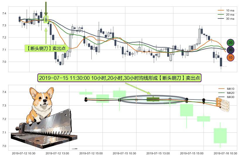 形态多维评估: ⚀ 2019-07-15 11:30:00小时显现 10小时-20小时-30小时均线 【断头铡刀】卖出点 看空信号,后市看跌,卖出