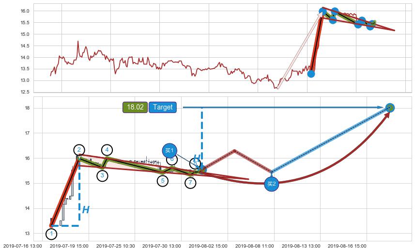 从2019-06-24 14:00至2019-07-31 15:00,共包含158个小时,阶段股价上涨12.13%,阶段股价变动位移路程比: 1 : 7