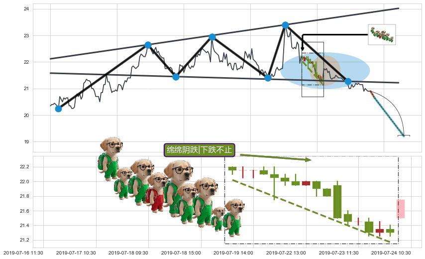 从2019-07-15 09:30至2019-07-31 15:00,共包含78个小时,阶段股价下跌-2.03%,阶段股价变动位移路程比: 1 : 21