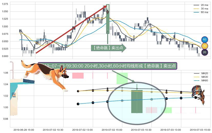 形态多维评估: ⚀ 2019-07-03 09:30:00小时显现 20小时-30小时-60小时均线 【绝命跳】卖出点 看空信号,后市看跌,卖出