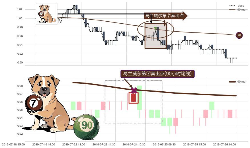形态多维评估: ⚀ 2019-07-23 15:00:00-小时显现 葛兰威尔均线 90小时均线 第⑦卖出点 下降趋势的中继信号,后市看跌,卖出信号