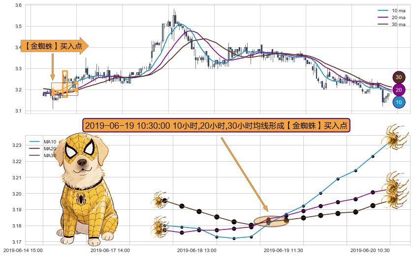 形态多维评估: ⚀ 2019-06-19 10:30:00小时显现 10小时-20小时-30小时均线 【金蜘蛛】买入点 看多信号,后市看涨,买入