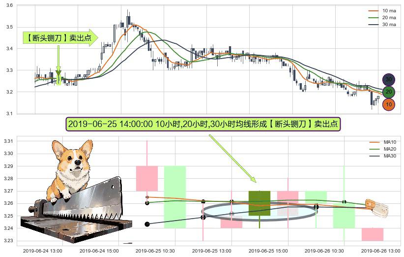 形态多维评估: ⚀ 2019-06-25 14:00:00小时显现 10小时-20小时-30小时均线 【断头铡刀】卖出点 看空信号,后市看跌,卖出