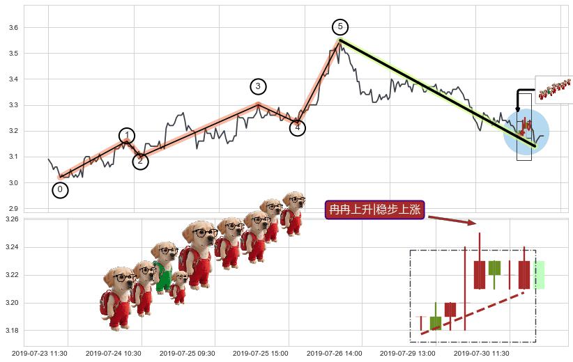 从2019-07-09 10:30至2019-07-31 15:00,共包含101个小时,阶段股价下跌-3.85%,阶段股价变动位移路程比: 1 : 10