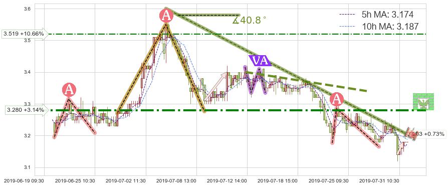 ➣ 预测:2019-08-02 14:00,【继续下探】稳定目前下跌趋势的前提下,预测价格:3.096