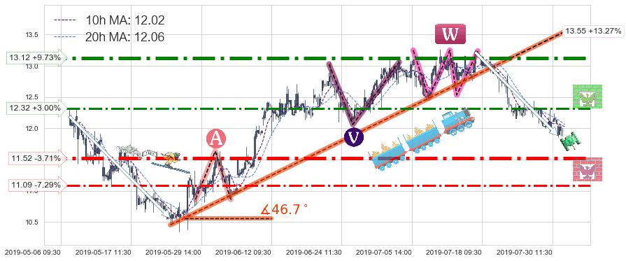 ♘ 阻力价格位13.12,可信任强度97.59%,距离最后交易2019-07-31 15:00形成的收盘价格11.96相差 +9.73%