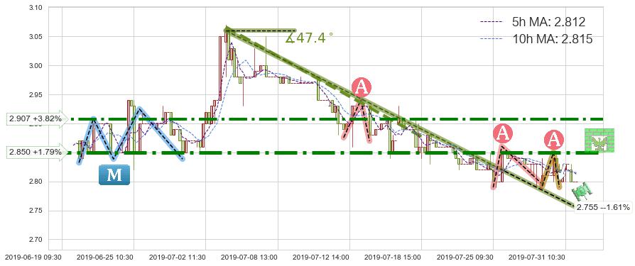 ⚔️ 2019-07-03 13:00-2019-07-25 11:30下跌趋势存在反转上涨[机会],其原下跌趋势的阻力位(2.755)已被突破[强支撑信号],原下跌趋势角度: 47.4˚