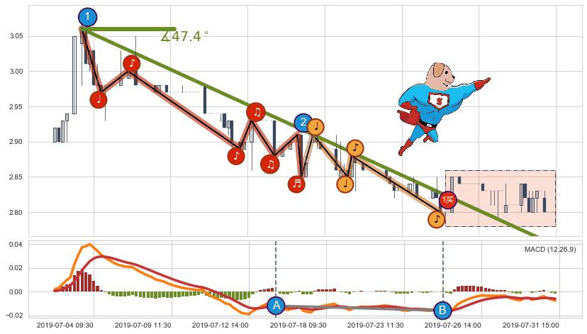 从2019-07-03 13:00至2019-07-25 11:30,共包含96个小时,阶段股价下跌-8.75%,阶段股价变动位移路程比: 1 : 3,下跌趋势角度: 47.4
