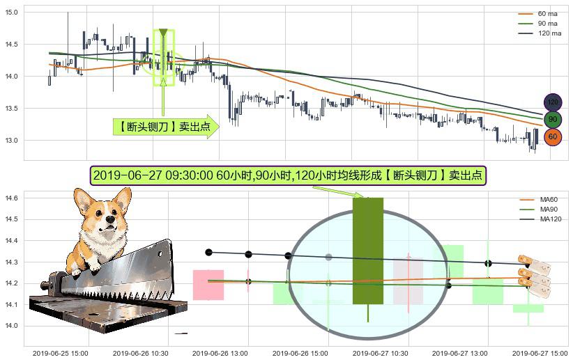 形态多维评估: ⚀ 2019-06-27 09:30:00小时显现 60小时-90小时-120小时均线 【断头铡刀】卖出点 看空信号,后市看跌,卖出