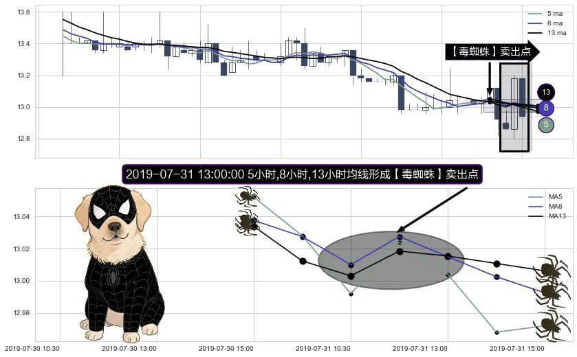 形态多维评估: ⚀ 2019-07-31 13:00:00小时显现 5小时-8小时-13小时均线 【毒蜘蛛】卖出点 看空信号,后市看跌,卖出