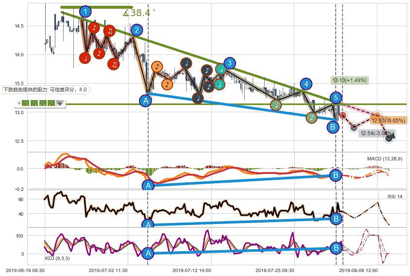 ➣ 预测:2019-08-06 12:00,【试探阻力】稳定目前下跌趋势的前提下,预测价格:12.93