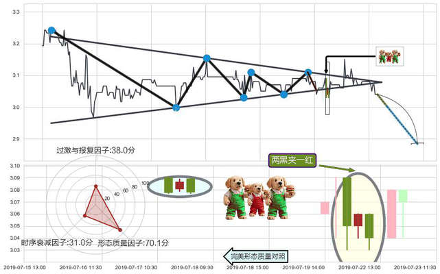 ➢ 🕰 价格走势在2019-07-22 09:30:00至2019-07-22 11:30:00期间形成两黑夹一红,残存影响值:-2.27