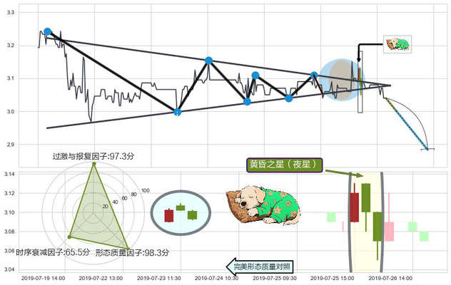 ➢ 🕰 价格走势在2019-07-25 15:00:00至2019-07-26 10:30:00期间形成黄昏之星(夜星),残存影响值:-4.65