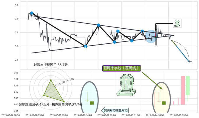➢ 墓碑十字线(墓碑线) 🔜 下降对称三角整理支撑破位转换阻力下跌 综合量化分数:43.35 【偏空】