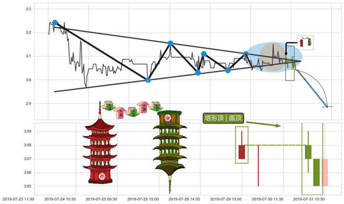 ➢ 🕰 价格走势在2019-07-29 13:00:00至2019-07-31 09:30:00期间形成塔形顶 | 圆顶,残存影响值:-9.20