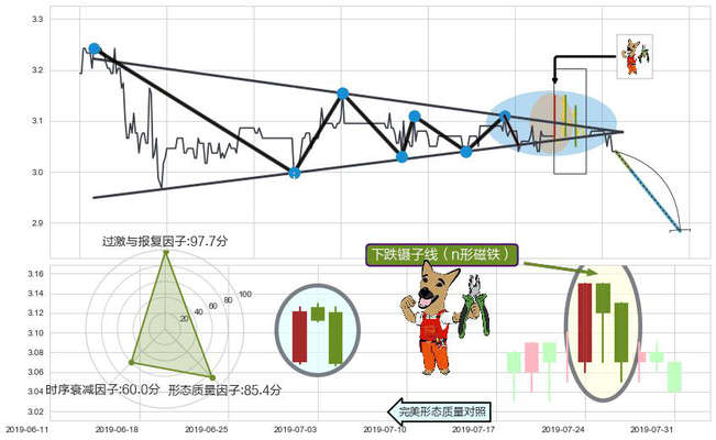 ➢ 🕰 价格走势在2019-07-24 00:00:00至2019-07-26 00:00:00期间形成下跌镊子线(n形磁铁),残存影响值:-3.53