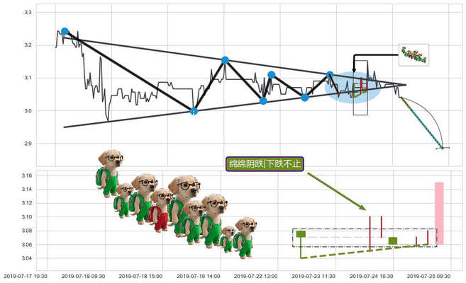 ➢ 🕰 价格走势在2019-07-22 15:00:00至2019-07-24 14:00:00期间形成绵绵阴跌|下跌不止,残存影响值:-4.60