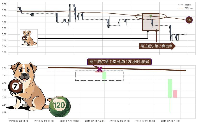 形态多维评估: ⚀ 2019-07-25 14:00:00-小时显现 葛兰威尔均线 120小时均线 第⑦卖出点 下降趋势的中继信号,后市看跌,卖出信号