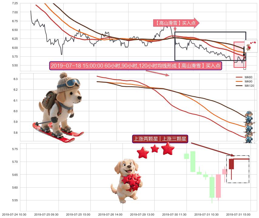 从2019-06-25 14:00至2019-07-31 15:00,共包含152个小时,阶段股价下跌-5.30%,阶段股价变动位移路程比: 1 : 15