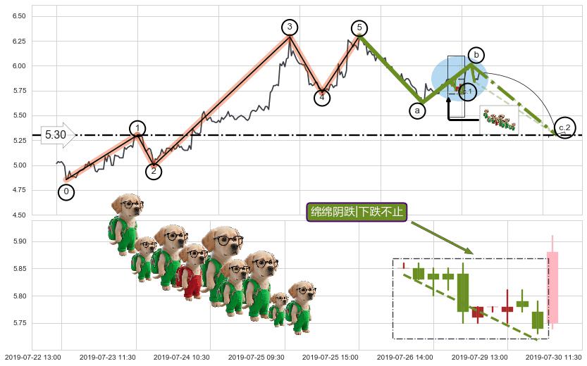 ➢ 最后的上涨趋势2019-05-23 14:00至2019-07-15 10:30:存在破位迹象,后续小调整或者反转下跌