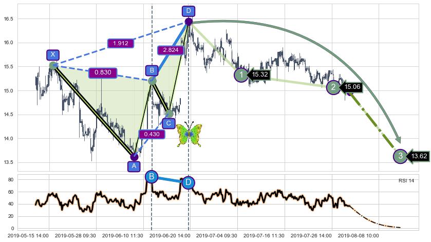 ➣ 已完成【蝴蝶】形态起点X: 02-15:14, 终点D: 06-05:14, 共439交易小时