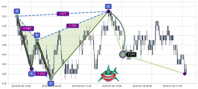 ➣ 未完成【蝴蝶】形态起点X: 06-25:10, 已到达C点: 07-19:11, 预测最终D点: 08-15:14, 共215交易小时