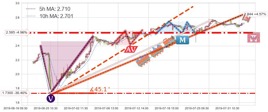 从2019-06-24 10:30至2019-07-31 15:00,共包含161个小时,阶段股价上涨47.12%,阶段股价变动位移路程比: 1 : 3