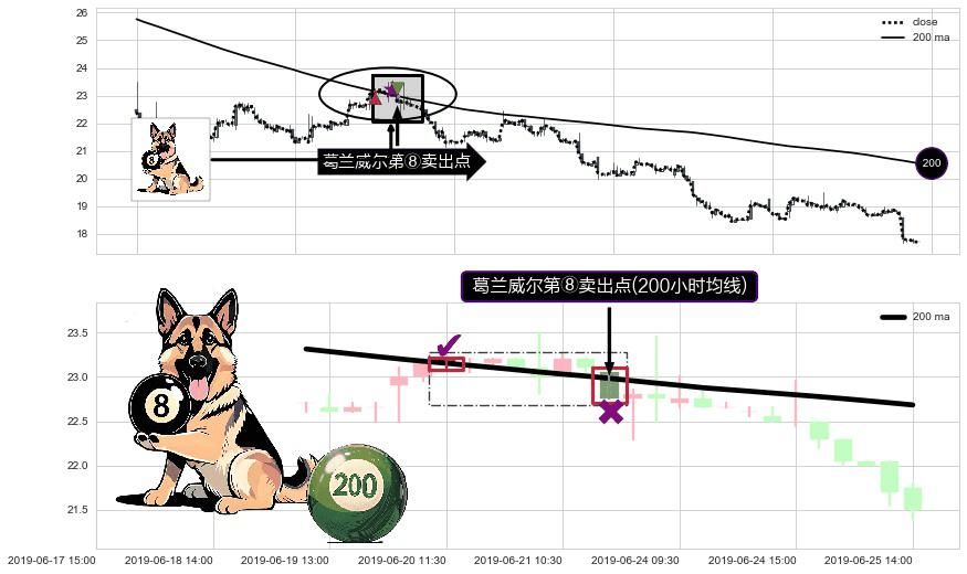 形态多维评估: ⚀ 2019-06-21 13:00:00-小时显现 葛兰威尔均线 200小时均线 第⑧卖出点 下降趋势的中继信号,后市看跌,卖出信号