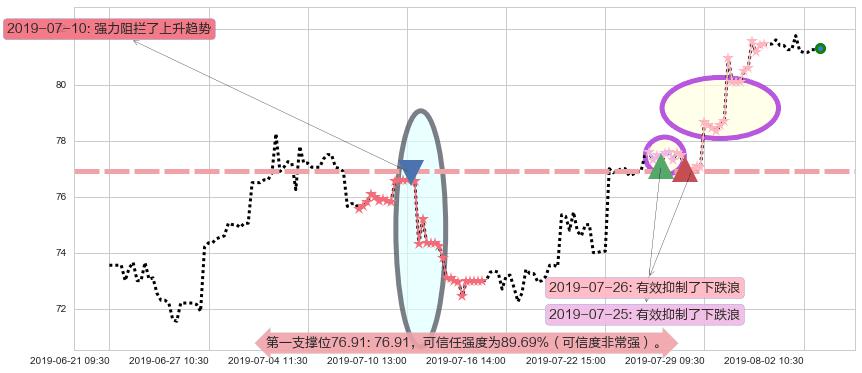 2019-07-26: 第一支撑位76.91有效抑制了下跌浪,成功阻止了价格的继续下跌。