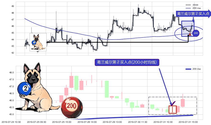 形态多维评估: ⚀ 2019-07-31 10:30:00-小时显现 葛兰威尔均线 200小时均线 第②买入点 上升趋势的中继信号,后市看涨,买进信号