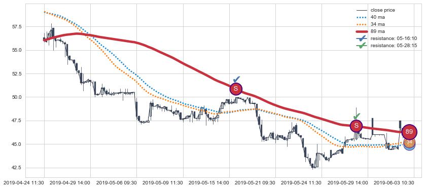 下跌趋势04-24 11:30-06-03 10:30,均线89确认关键阻力2处