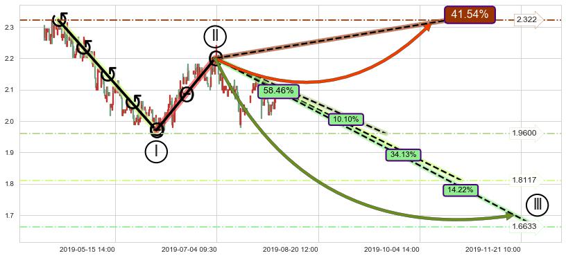 ➣ 调整浪已超过预测的c点位置,后续大趋势循环浪继续下跌概率58.46%,谨慎做多