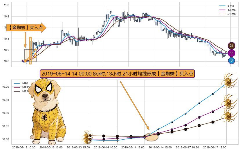 形态多维评估: ⚀ 2019-06-14 14:00:00小时显现 8小时-13小时-21小时均线 【金蜘蛛】买入点 看多信号,后市看涨,买入