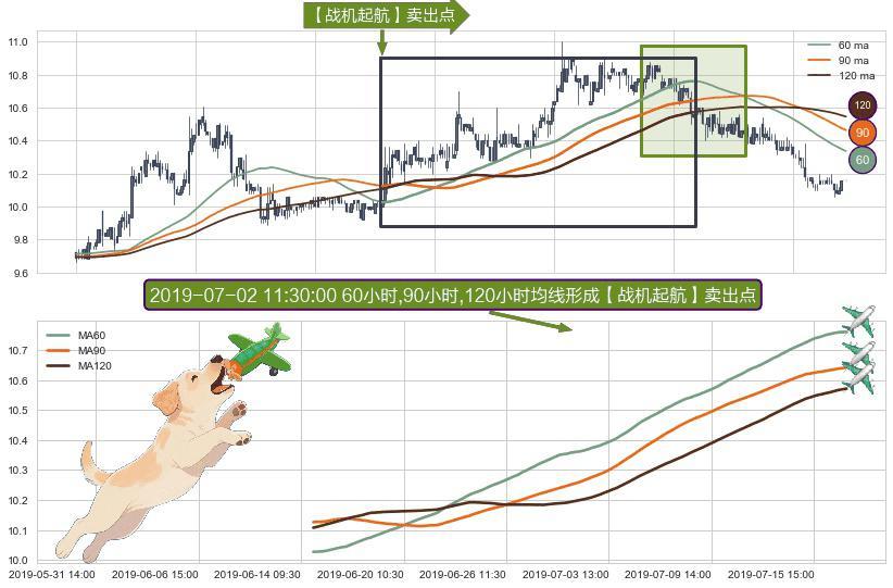 形态多维评估: ⚀ 2019-06-14 13:00:00小时-2019-07-17 10:30:00小时显现 60小时-90小时-120小时均线 【战机起航】卖出点 看空信号,后市看跌,卖出