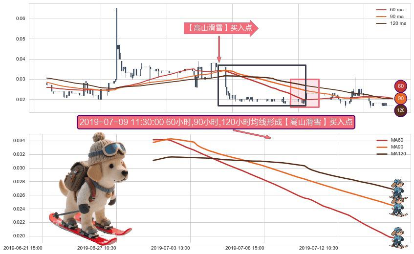 形态多维评估: ⚀ 2019-06-28 15:00:00小时-2019-07-16 14:00:00小时显现 60小时-90小时-120小时均线 【高山滑雪】买入点 看多信号,后市看涨,买入
