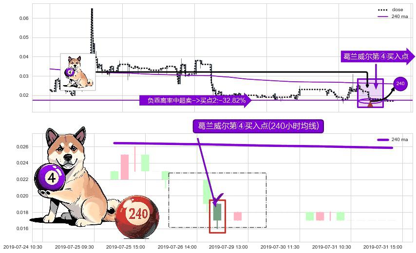 形态多维评估: ⚀ 2019-07-29 09:30:00-小时显现 葛兰威尔均线 240小时均线 第④买入点 下降趋势均值回复的短线反弹信号,后市看涨,买进信号