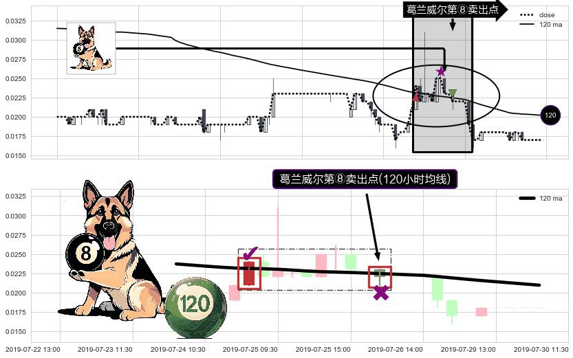 形态多维评估: ⚀ 2019-07-26 10:30:00-小时显现 葛兰威尔均线 120小时均线 第⑧卖出点 下降趋势的中继信号,后市看跌,卖出信号