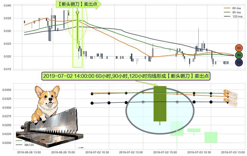 形态多维评估: ⚀ 2019-07-02 14:00:00小时显现 60小时-90小时-120小时均线 【断头铡刀】卖出点 看空信号,后市看跌,卖出