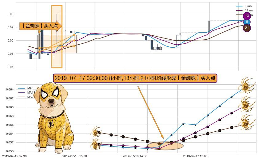 形态多维评估: ⚀ 2019-07-17 09:30:00小时显现 8小时-13小时-21小时均线 【金蜘蛛】买入点 看多信号,后市看涨,买入