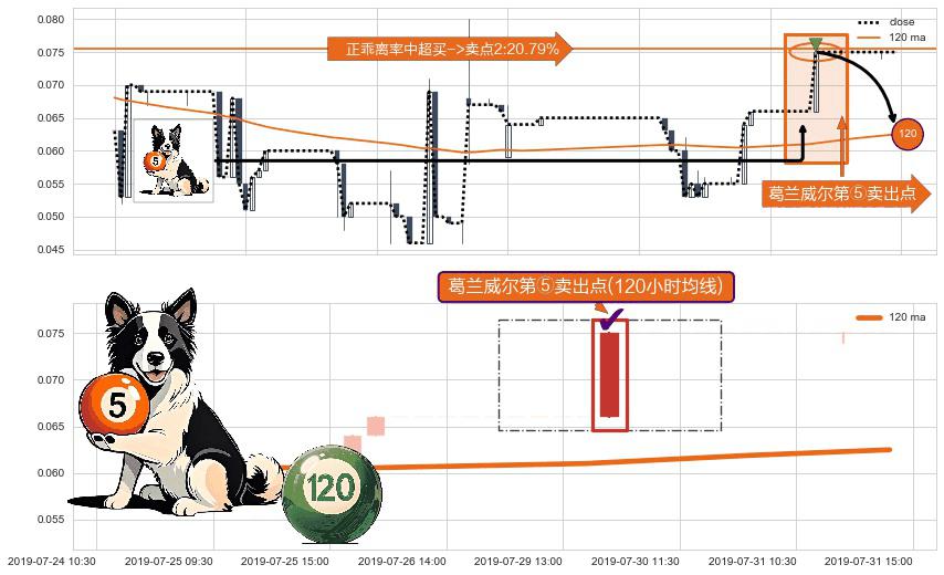 形态多维评估: ⚀ 2019-07-29 15:00:00-小时显现 葛兰威尔均线 120小时均线 第⑤卖出点 上升趋势均值回复的短线回落信号,后市看跌,卖出信号