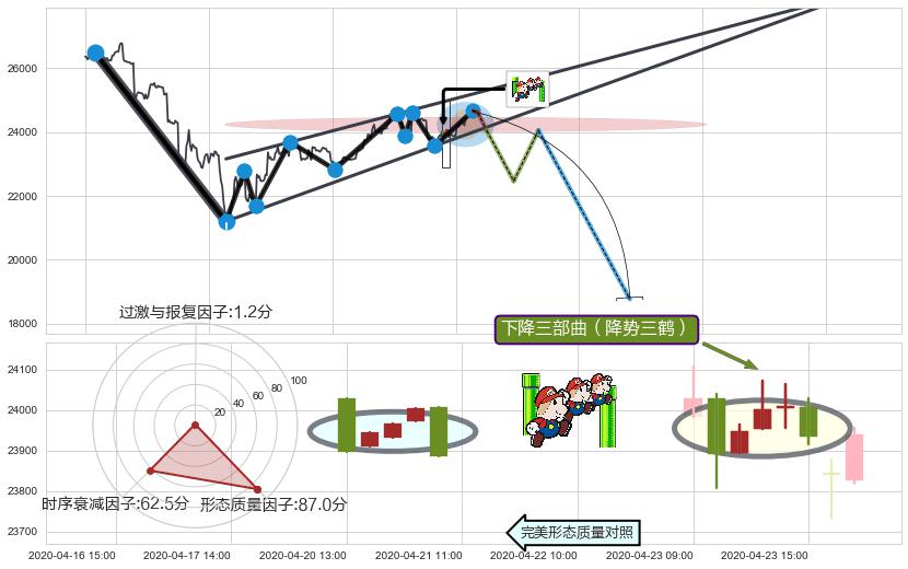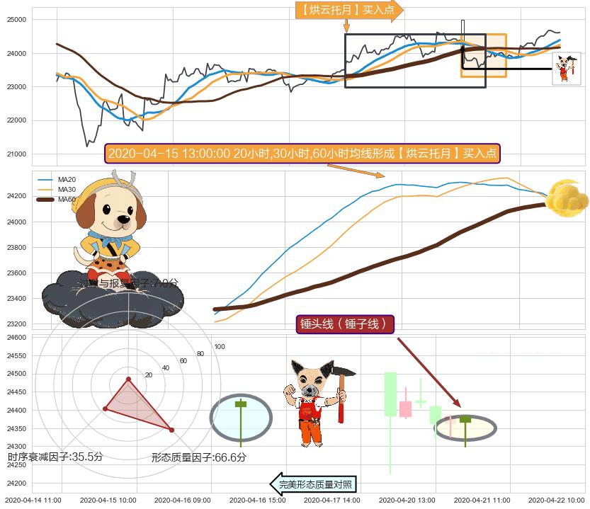 从2020-04-15 09:00至2020-04-17 09:00,共包含13个小时,阶段股价上涨0.23%,阶段股价变动位移路程比: 1 : 30