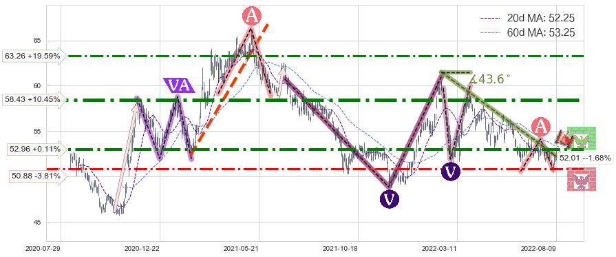 ♘ 阻力价格位58.43,可信任强度93.89%,距离最后交易2022-08-12形成的收盘价格52.90相差 +10.45%