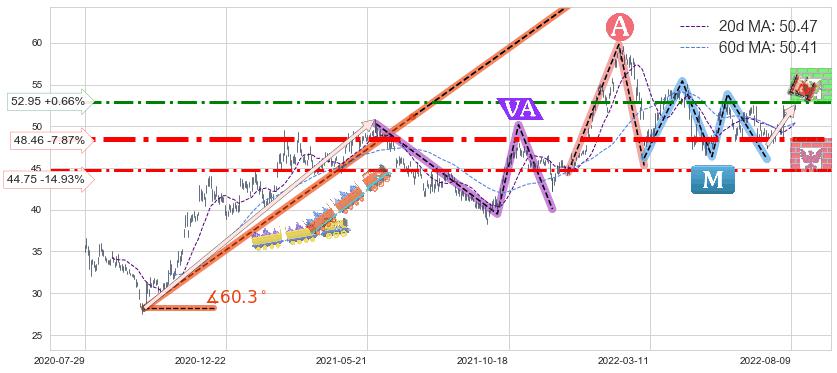♘ 支撑价格位48.46,可信任强度88.55%,距离最后交易2022-08-12形成的收盘价格52.60相差 -7.87%